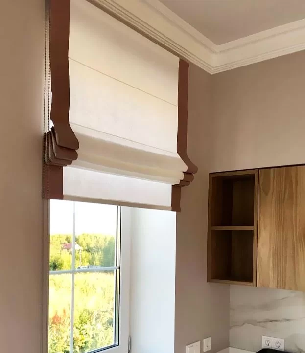 Для придания римской шторе менее аскетичного вида, она может быть изготовлена с кантом, бахромой или фигурным низом.